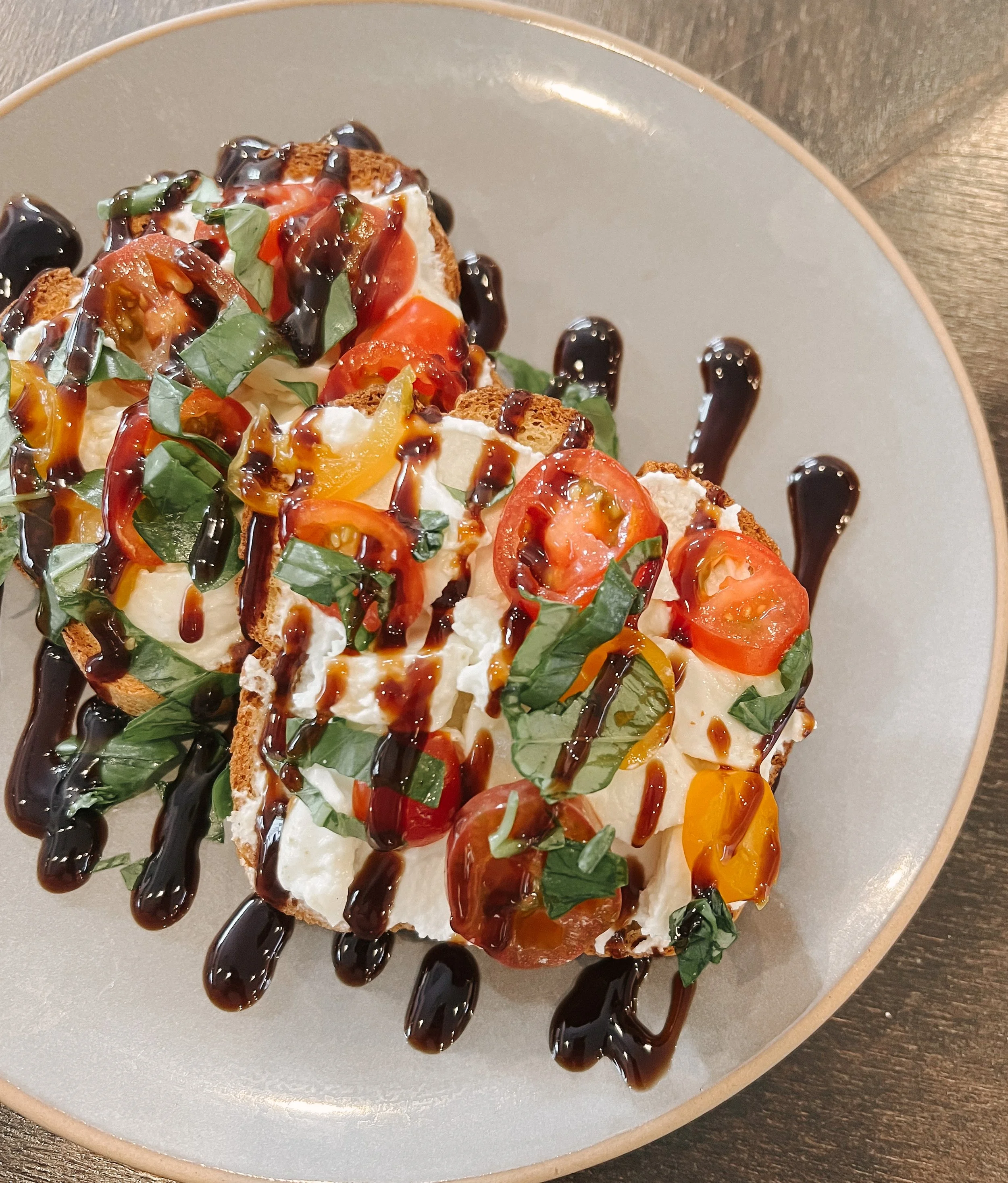 This is a colorful dream meal for our vegetarian friends. Perfectly toasted sourdough bread (or gluten free bread upon request like this one) is topped with sliced fruit, basil, ricotta, mozzarella and drizzled with balsamic glaze.